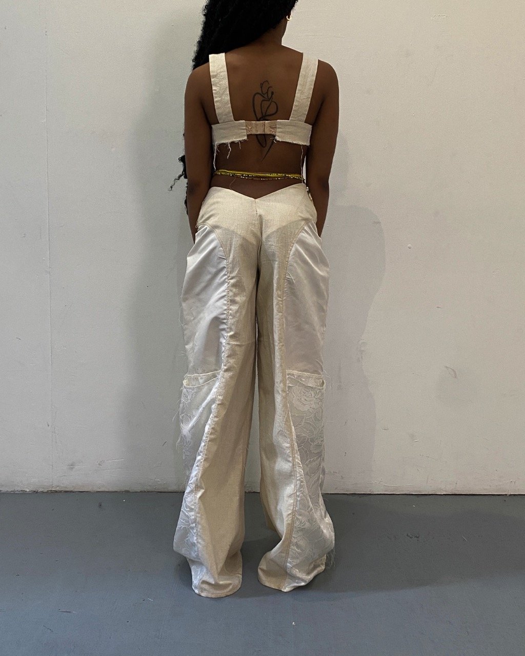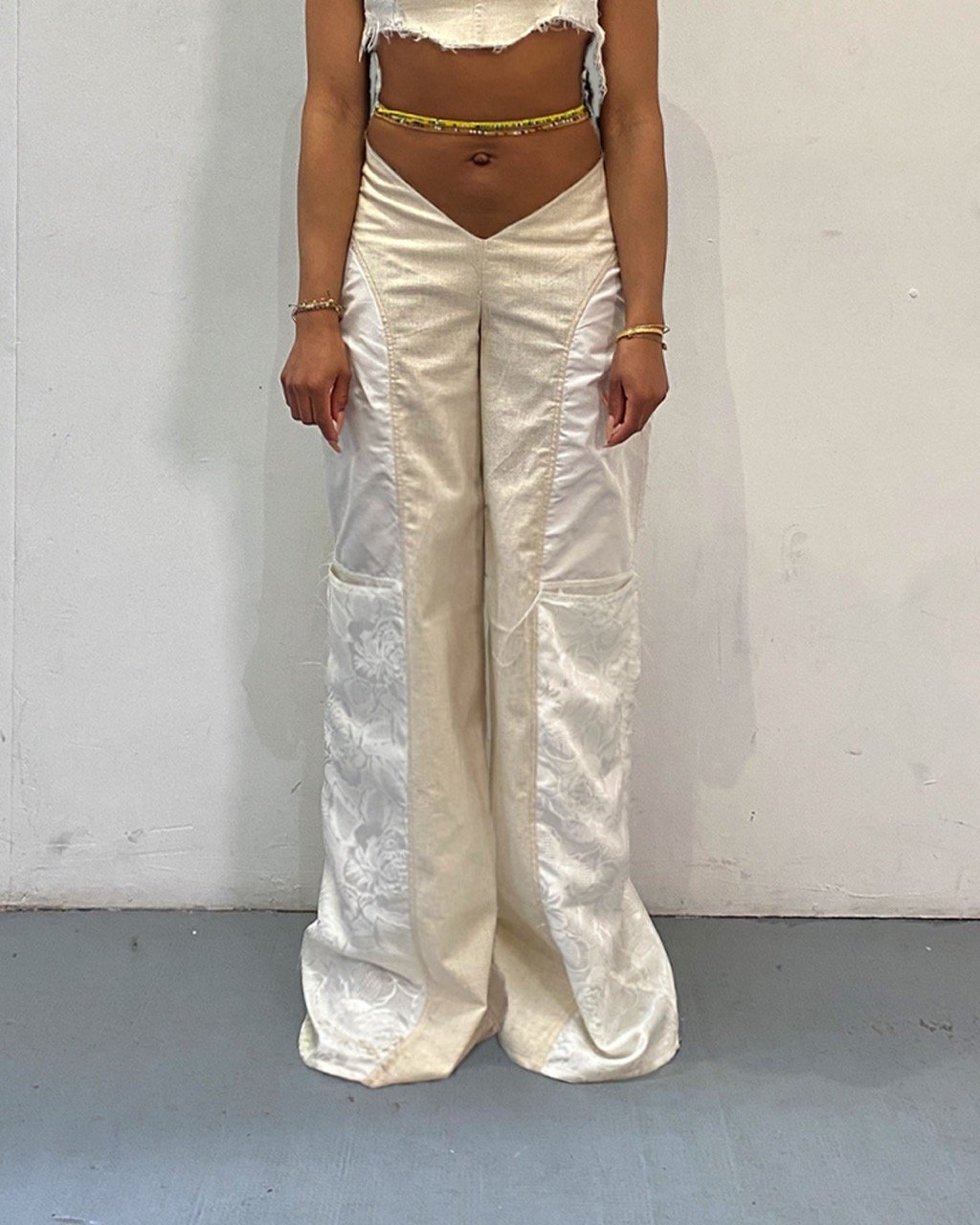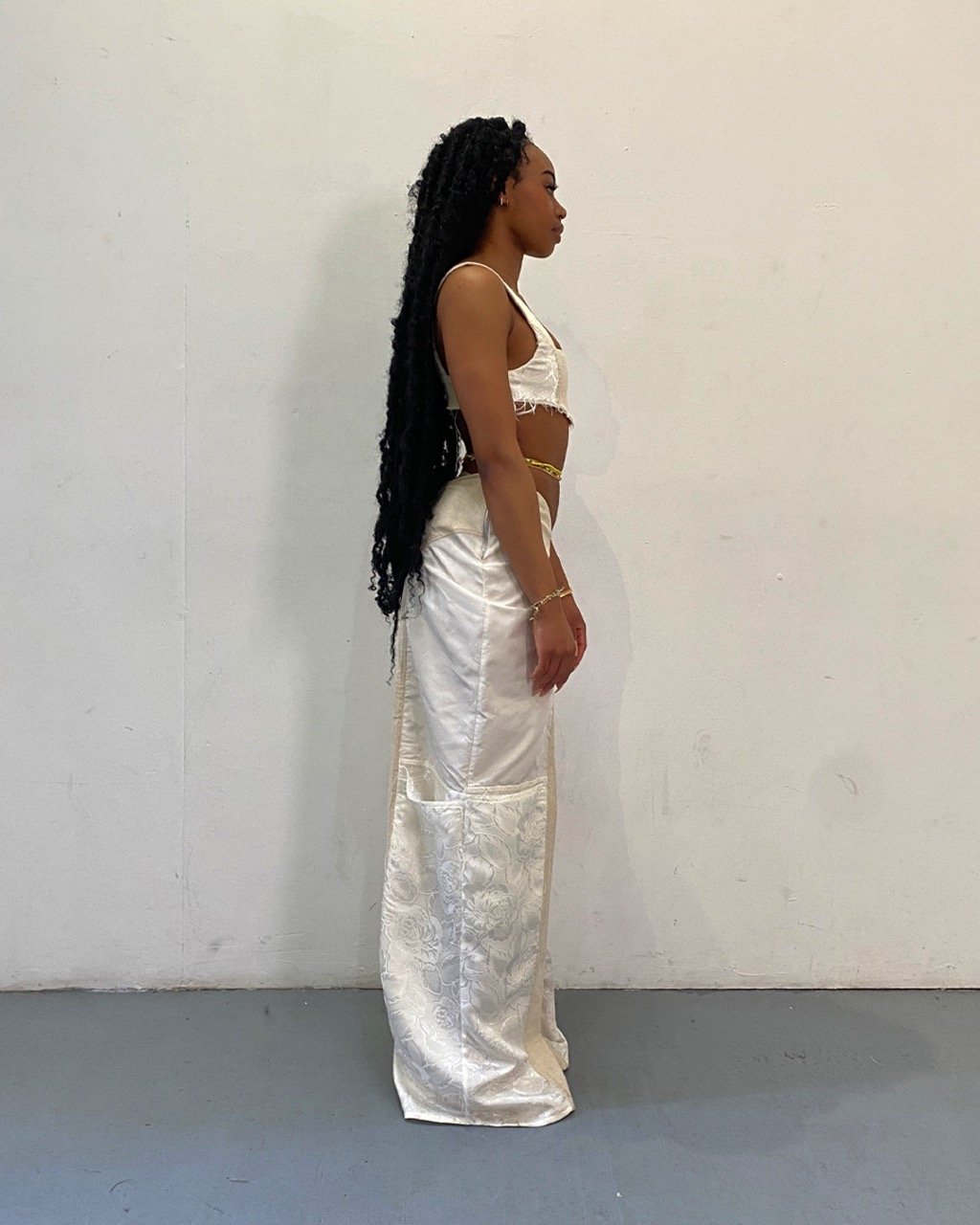 Created from a thick cotton curtain, a silk taffeta sourced from a luxury deadstock and an artificial tablecoth with woven flowers.